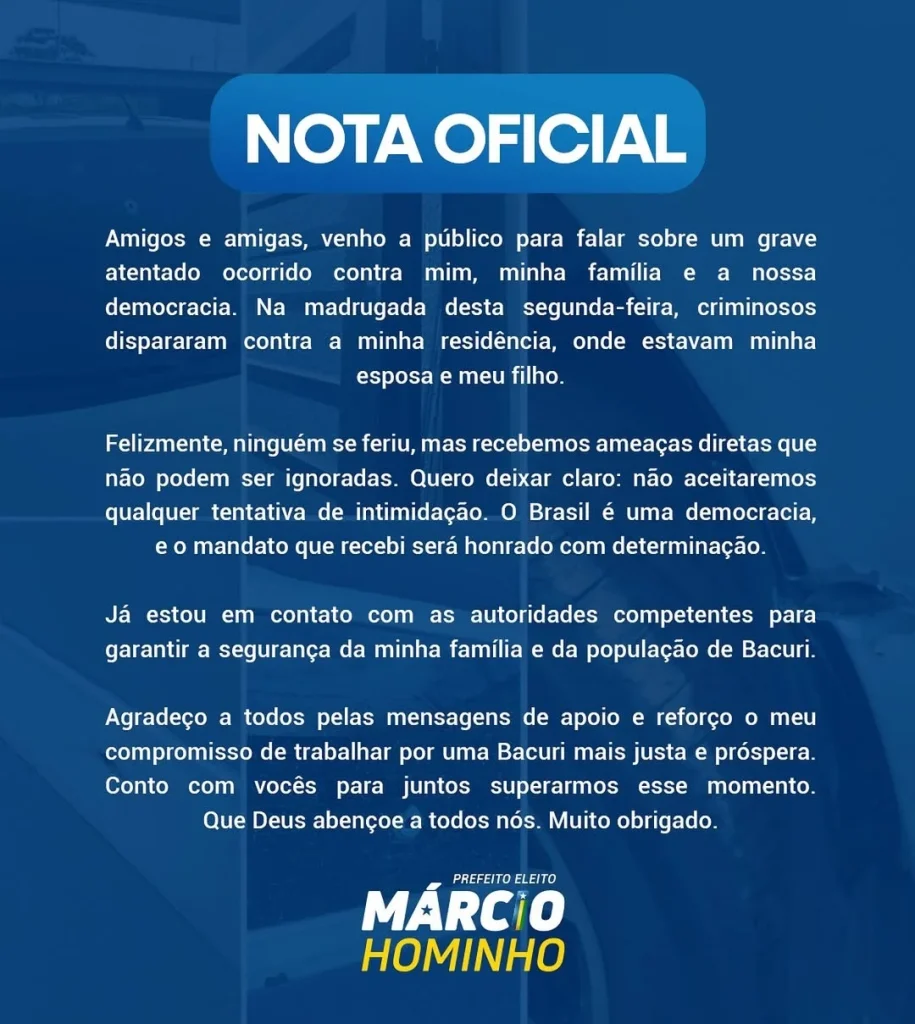 Durante o ataque feito por dois homens em uma motocicleta, um bilhete foi arremessado no terraço da casa, no qual estava escrito que Hominho não assumirá o cargo de prefeito a partir de janeiro. Em resposta, Hominho manifestou-se com firmeza, afirmando: “Não aceitaremos qualquer tentativa de intimidação. Atos de violência jamais nos farão recuar.”